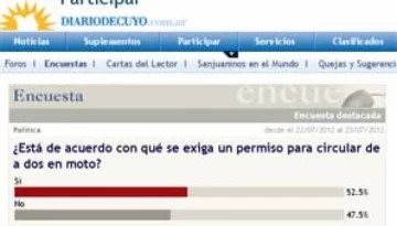 Al respecto, DIARIO DE CUYO ONLINE realizó una encuesta cuya consigna fue la siguiente: ¿Está de acuerdo con qué se exija un permiso para circular de a dos en moto? De 3.728 lectores que participaron, la mayoría se mostró a favor de la iniciativa.