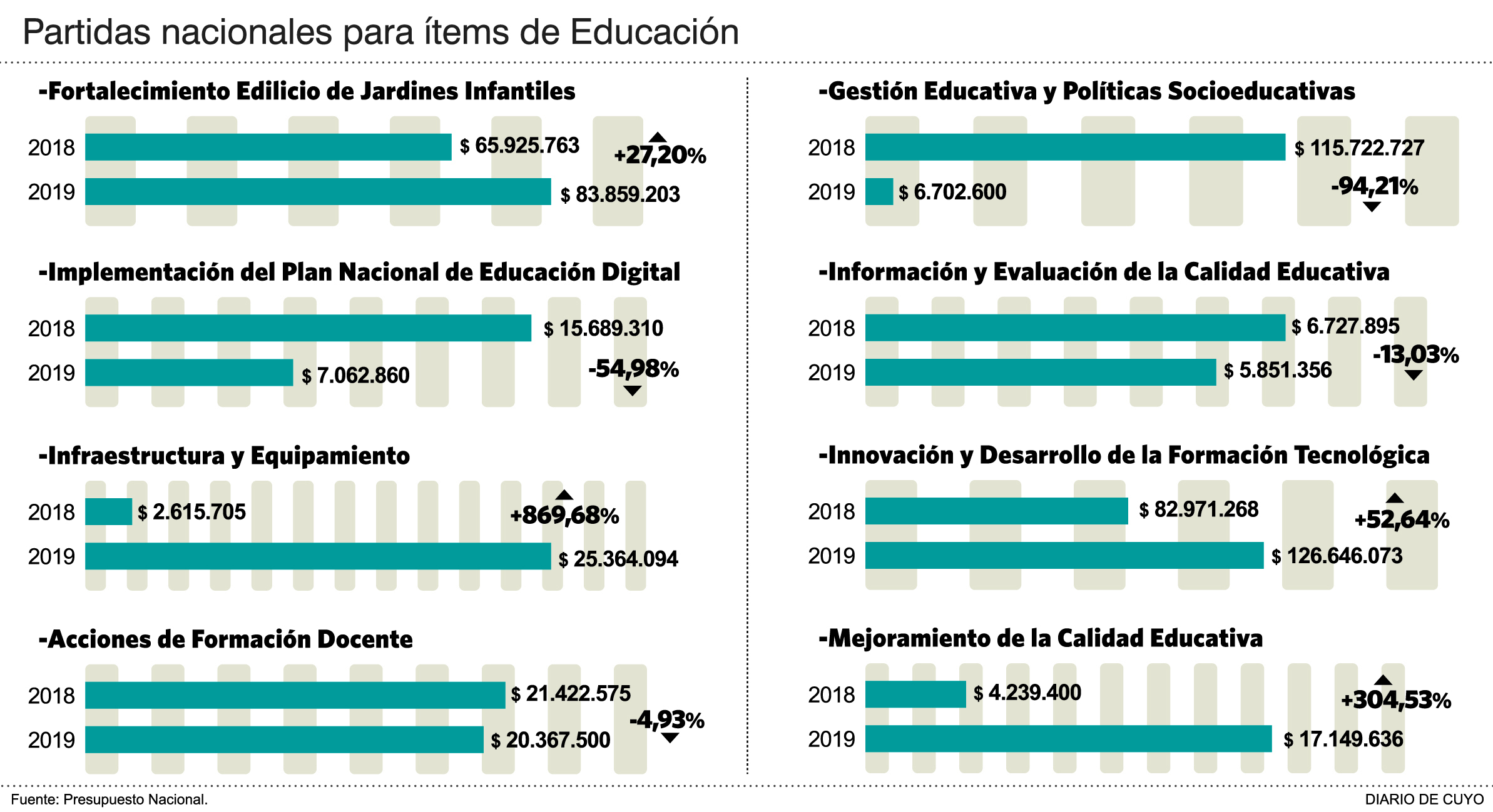 A través de planes y programas, la Nación envía recursos a todas las provincias para apuntalar políticas en materia de apoyo escolar, evaluación y mejora educativa y obras edilicias. Se trata de refuerzos para sostener el sistema y para equilibrar las inequidades entre los distintos distritos. En San Juan, lo presupuestado para este año es de 316.702.643 pesos, mientras que para 2019 es de 297.851.722, lo que refleja una reducción del seis por ciento. En el cálculo no se toma en cuenta la partida del Plan Progresar, que en este período se computó dentro del Ministerio de Trabajo de la Nación y para el próximo fue a parar a la cartera educativa.