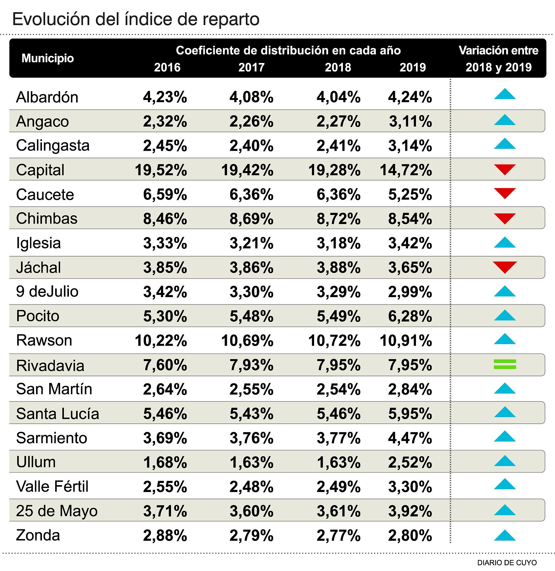En la llamada coparticipación secundaria, el porcentaje que le toca a cada municipio, hay cambios centrales. Uñac ya había dado las pinceladas para implementar un nuevo sistema en busca de corregir las desigualdades que había generado el régimen anterior. En 2017 definió que de la totalidad de los fondos para los departamentos, el 80 por ciento fuera de manera tradicional, mientras que el 20 restante fuera distribuido de acuerdo a criterios como población, necesidades básicas insatisfechas, infraestructura escolar y seguridad. El mecanismo produjo cambios para cada comuna. Un ejemplo fue Rawson, que mejoró su índice, ya que siempre reclamó por más dinero por ser el departamento con más habitantes. Por otro lado, quien fue perdiendo coeficiente a través del tiempo fue Capital (Ver infografía).