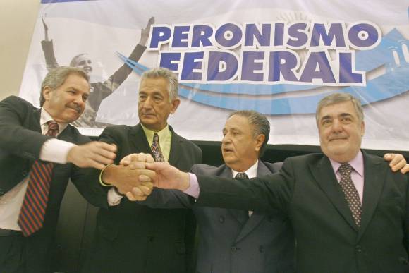 Los postulantes Eduardo Duhalde, Felipe Solá, Mario Das Neves y Alberto Rodríguez Saá tomaron sus manos y las alzaron en gesto triunfante mientras a su lado aplaudía el resto de los principales referentes del PJ opositor, con excepción de Francisco De Narváez, cuyo faltazo se daba por descontado. En el escenario del acto de relanzamiento de la fuerza que sueña con desbancar al kirchnerismo de la Casa Rosada -celebrado en el hotel NH, en la ciudad de Buenos Aires-, también se encontraban los senadores Carlos Reutemann, Juan Carlos Romero y Adolfo Rodríguez Saá y el ex gobernador de Misiones Ramón Puerta, todos coordinadores de la fuerza. "Y ya lo ve y ya lo ve, es para Kirchner que lo mira por TV", estalló la nutrida concurrencia cuando los cuatro aspirantes posaron ante los reporteros gráficos, en una imagen que estuvo a punto de naufragar por los chispazos de los últimos días entre los candidatos presidenciales.