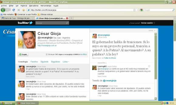 "El gobernador habla de traiciones. Si lo suyo es un proyecto personal, ¿traición a quién? ¿A la Patria? ¿Al movimiento? ¿A su palabra? ¿A la ley?". Con esta frase, vía Twitter (foto) el senador César Gioja salió ayer a responderle a su hermano José Luis Gioja, las expresiones que este último volcó el sábado en el programa Misión Imposible (Radio Colón). Esa fue la primera charla a fondo que el gobernador dio en un medio, respecto de la re-reelección y donde, con mesura, apuntó a su hermano mayor con opiniones como "las traiciones siempre duelen y si son de muy cerca, siempre duelen más". El senador no usaba Twitter para la campaña contra la re-re desde el inicio de sesiones en la Cámara, el 1 de abril último.
