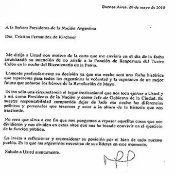 Me dirijo a Usted con motivo de la carta que me enviara en el día de la fecha anunciando su intención de no asistir a la Función de Reapertura del Teatro Colón en la noche del Bicentenario de la Patria.