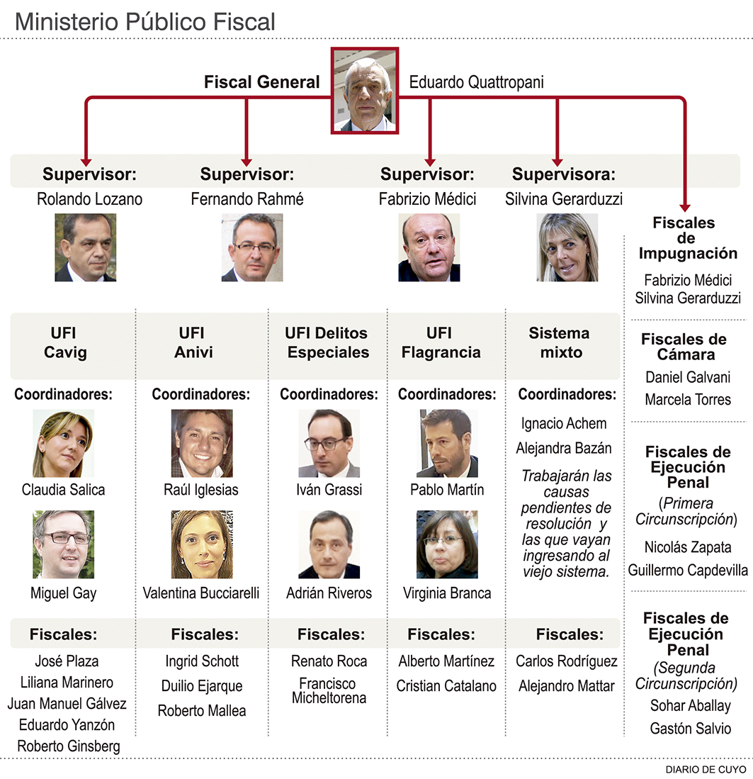 Luego de analizar el perfil de los 14 nuevos fiscales y ver su desempeño "en el campo", el jefe del Ministerio Público, Eduardo Quattropani, armó el organigrama y la distribución del equipo para el sistema acusatorio, al que se suman los que ya venían cumpliendo tareas en el esquema anterior. El peso, ahora, estará en los fiscales, ya que la investigación de los delitos quedó en sus manos, quienes, en un trabajo conjunto con la Policía, reunirán las pruebas y acusarán a los sospechosos ante los jueces, los que actuarán controlando que se respeten las garantías constitucionales. "A partir de la vigencia del nuevo sistema, habrá un ejército de fiscales y ayudantes fiscales al servicio de la gente", destacó Quattropani, quien resaltó que "el éxito está asegurado".