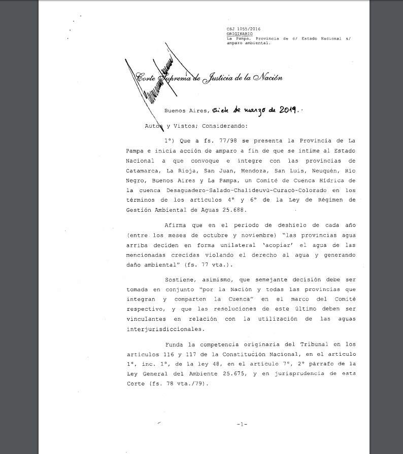 Tras eso, el secretario de Recursos Hídricos pampeano, Javier Schlegel, celebró la resolución y señaló que “es la primera vez que la Corte Suprema de Justicia interviene y emite un documento, en este caso favorable a La Pampa, respecto al río Desaguadero. Es muy importante, es la cuenca más grande del país” e involucra a San Luis, San Juan, Mendoza, Río Negro, Neuquén, La Rioja y Buenos Aires.