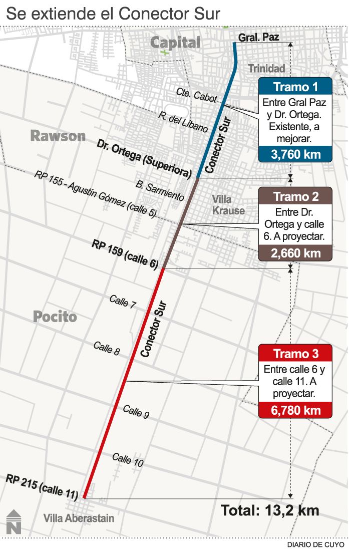 Las necesidades de cambio en el Conector Sur radican en la cantidad de accidentes que han ocurrido desde que la vía rápida está operativa. Incluso, especialistas de la Facultad de Ingeniería de la Universidad Nacional de San Juan UNSJ llevaron adelante en 2012 una investigación que determinó que el acceso presenta problemas en cuanto a la seguridad vial, como las rotondas, los guardarrailes, la señalización y las esquinas de los cordones y de las rotondas, entre otros. A su vez, desde la Escuela de Ingeniería de Caminos de Montaña y el Observatorio de Seguridad Vial se mostraron coincidentes con dicho análisis. Por su parte, desde Vialidad Provincial, su titular, Juan Manuel Magariños, anunció a principio de año que se iban a llevar adelante las mejoras, pero las mismas surgirían de un estudio final encarado por una consultora, tarea que sería convocada a través de una licitación. Hubo demoras con el traspaso a la provincia de los tramos que dependen de Capital y Rawson, pero con eso culminado, hoy se hará la apertura de sobres para conocer las ofertas. Como le aplicarán cambios a la vía, el Ejecutivo decidió sumar un estudio para ampliar el trayecto actual: primero desde Dr. Ortega, en Rawson, hasta Calle 6 en Pocito, y luego desde ahí hasta Calle 11 (ver infografía), por lo que el trayecto se irá a un total de 13,2 kilómetros.