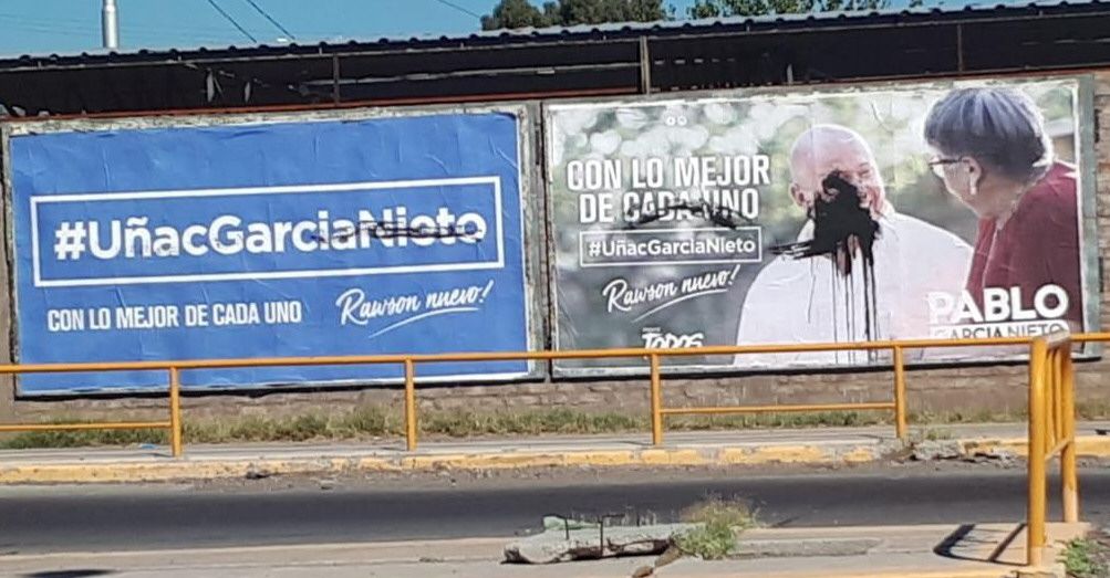 La interna peronista entre los sectores de los postulantes a la Intendencia de Rawson recrudeció fuertemente en los últimos dos días. La novedad fue que ayer aparecieron pintadas que tapaban la imagen y el slogan en carteles de Pablo García Nieto. El jefe de la bancada del PJ en la Legislatura difundió un comunicado en el que manifestó su preocupación frente el "acto vandálico" y ante este medio calificó la movida de "lamentable", aunque no pudo atribuírsela a nadie en particular. Sin embargo, desde su entorno de campaña miran con recelo al espacio de Rubén García, el secretario de Obras municipal, su rival en las primarias. Este último manifestó que ese tipo de jugadas "no son de su estilo" ni tiene gente que haga eso. Inclusive señaló que él también sufrió la rotura de carteles con su foto y que por eso no va a hacer la denuncia, dado que es como "el folklore de campaña".