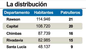 Teniendo en cuenta los datos del último censo poblacional realizado en el 2010 y aclarando que se dividirá la cantidad de ciudadanos de cada comuna en 5500, para determinar el número de patrulleros que deberán comprarse, se desprende que Rawson deberá adquirir 21 patrulleros, lo sigue Capital con 20, Chimbas con 16, Rivadavia 15, Pocito y Santa Lucía con 9, ver gráfico.