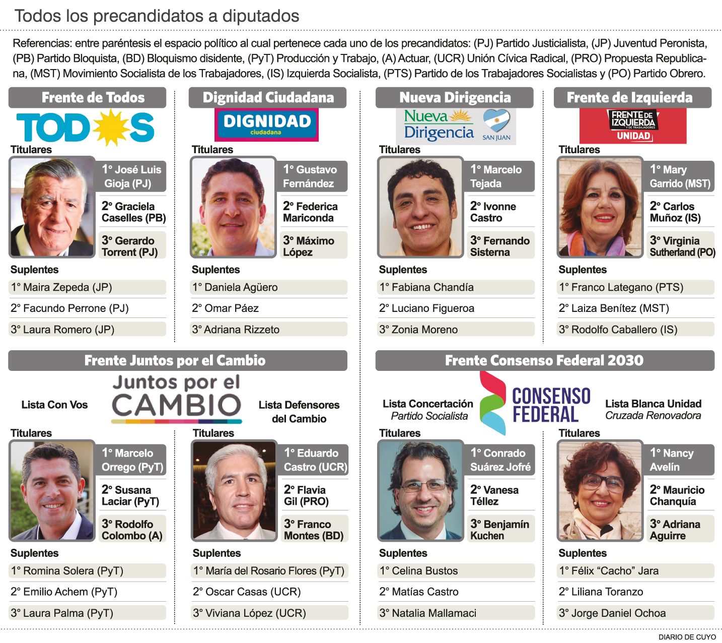 Los referentes de cada espacio que estarán al tope de la lista son José Luis Gioja, actual diputado nacional; Marcelo Orrego, presidente de Producción y Trabajo y líder del principal frente opositor; Eduardo Castro, titular de la UCR que irá en interna contra el basualdista; Mary Garrido, mandamás de la Nueva Izquierda; y Nancy Avelín, de la Cruzada Renovadora. Esta última se enfrentará dentro del Frente Consenso Federal con el socialismo, con Conrado Suárez Jofré a la cabeza.