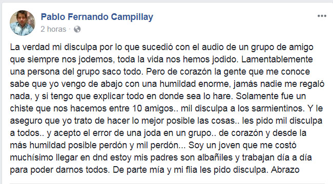 Los audios se volvieron virales rápidamente y al concejal no le quedó otra que salir a dar explicaciones. Así, en su cuenta de Facebook, Campillay pidió disculpas. “La verdad mi disculpa por lo que sucedió con el audio de un grupo de amigos que siempre nos jodemos, toda la vida nos hemos jodido. Lamentablemente una persona del grupo sacó todo”, escribió.