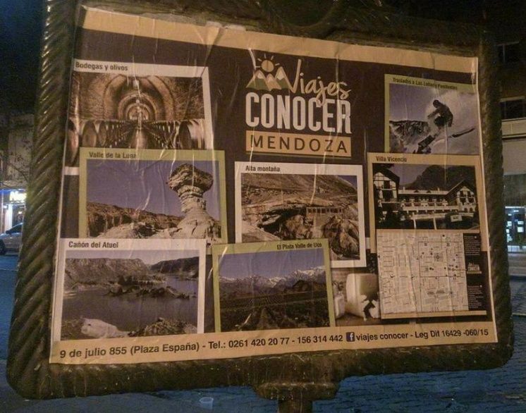El Cañón del Atuel, Villa Villavicencio, Bodegas y Olivos, Malargüe y Las Leñas son algunos de los destinos locales que promociona el afiche de “Viajes Conocer” y que, por alguna cuestión, incluyó al Valle de la Luna sin aclarar que se encuentra en San Juan.