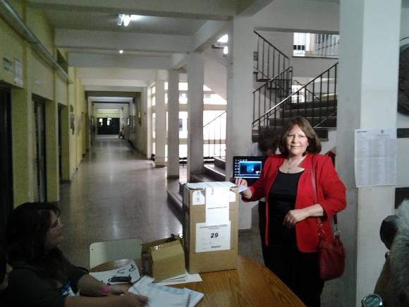 San Juan 27 de octubre.- La mujer del primer mandatario provincial, Rosa Palacio llegó a la Escuela Industrial para emitir su sufragio en estas elecciones legislativas 2013. Lo hizo acompañada de su hijo Camilo quién vota en el mismo establecimiento pero por cábala lo hace a la tarde, explicó ante los medios.