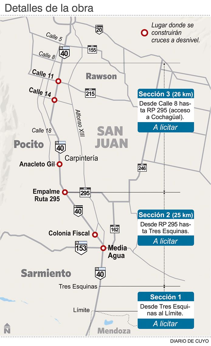 El tramo III es el que recién tiene un guiño del Banco Interamericano de Desarrollo (BID) para su financiamiento. Es el que cuenta con una mayor urbanización, dado que abarca la zona de ingreso a Villa Aberastain y Carpintería, en Pocito. En los 26 kilómetros de recorrido, el proyecto original contemplaba la expropiación de 350 inmuebles. Sin embargo, en Vialidad Nacional apuntaron a bajar ese número. Así, Deiana explicó que se levantará la Ruta 40 por sobre vías provinciales (formando cruces a desnivel en Calle 11, 14 y Anacleto Gil) y en otros sectores. Al elevar la ruta nacional, se harán taludes verticales y se pondrá un muro de tierra armada, por lo que el ancho en la zona de colectoras es menor, sumado a que estos caminos irán pegados a los muros. De esa forma, se achica el terreno a utilizar y, por ende, se harán menos expropiaciones.