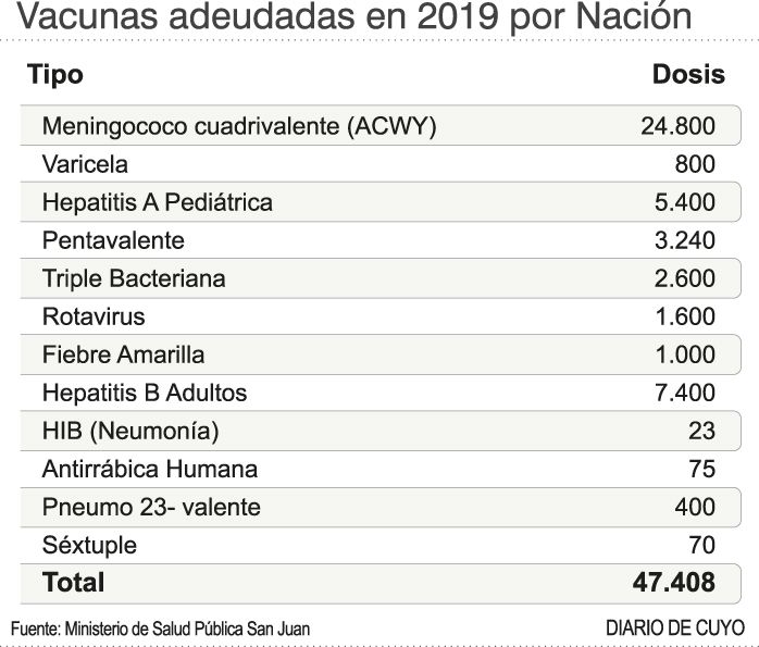 La situación más crítica es por las vacunas. Desde la cartera sanitaria indicaron que son 47.408 dosis de distintos tipos que Nación debe enviar a San Juan para que las personas tengan acceso gratuito (ver infografía). Sin embargo, la gestión macrista no ha mandado ninguna de ellas. Las de meningitis son 24.800 dosis que el Gobierno provincial tuvo que salir a comprar las esenciales para que no haya faltantes, mientras que del resto tiene stock para hacerle frente al calendario.