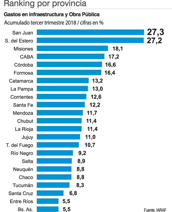 El resorte de la obra pública es clave, ya que tiene varias aristas. Los fondos van a la edificación de viviendas para atender el déficit habitacional, a la reparación y construcción de nuevos caminos que favorecen la circulación de los habitantes, de las empresas que transportan su producción y del turismo, y al mejoramiento de edificios públicos, entre otros. La inyección de dinero público además mueve la rueda económica al favorecer la contratación de empresas, el empleo de mano de obra y la compra de insumos y productos como hierro, cemento y áridos. La administración de Sergio Uñac viene apostando fuerte al destino de recursos en infraestructura y los números lo revelan. Según el informe del Instituto Argentino de Análisis Fiscal (IARAF), la provincia lidera las posiciones en todo el país en inversión público, con un 27,3 por ciento de gasto de capital del universo de erogaciones. Es decir, arriba de los grandes distritos como Ciudad y provincia de Buenos Aires, Córdoba, Santa Fe y Mendoza (ver infografía). El resto de los gastos son los llamados corrientes, que tienen que ver con los sueldos del personal, los insumos para el funcionamiento de la administración y los gastos sociales para la atención de los sectores más vulnerables, entre los principales. Este último, un ítem que el Gobierno no ha descuidado frente a la crisis económica nacional.
