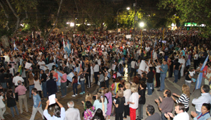 San Juan, 18 de abril.- Pasadas las 20, la marcha local en contra de las políticas nacionales comenzó en la plaza central de la ciudad. Con cacerolas, pancartas y cornetas, los manifestantes esperaron ser un buen número para comenzar a girar por las calles lindantes a la plaza.