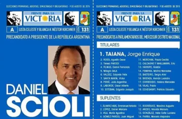 Buenos Aires, 30 de junio.- La Lista 131 "Celeste y Blanca K Néstor Kirchner" tiene arriba de la fórmula presidencial Daniel Scioli-Carlos Zannini las tradicionales imágenes en blanco y negro de Juan Perón y Eva Duarte, a la izquierda, y a la derecha la de Kirchner junto al escudo del Partido Justicialista.
