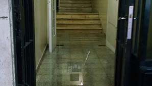 San Juan, 25 de noviembre.- El edificio del Juzgado Laboral ubicado sobre calle Laprida, entre Mendoza y Entre Ríos, amaneció inundado. El agua baja por las escaleras, único acceso, y llega hasta la calle.
