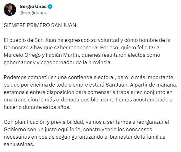 Por último, Uñac dijo que "vendrán nuevos tiempos en San Juan y espero que desde este lunes comience la transición con el gobernador electo para que la provincia continúe por el camino del crecimiento. A pesar de las diferencias partidarias e ideológicas, tenemos que trabajar todos juntos por los sanjuaninos".