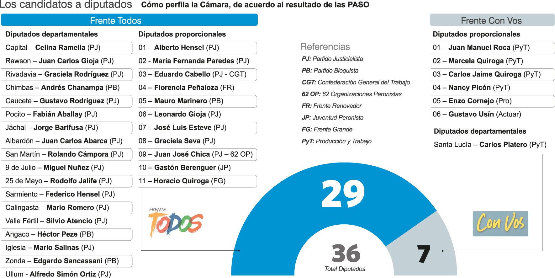 Las Primarias Abiertas, Simultáneas y Obligatorias (PASO) sirvieron de testeo en el escenario provincial y si el Frente Todos, que lidera el gobernador Sergio Uñac, repite los resultados en la general del 2 de junio meterá 29 diputados, seis más que en 2015. De confirmarse, la cifra le dará una holgada mayoría calificada para sancionar leyes especiales sin la necesidad de acuerdos con otras fuerzas políticas, ya que superará los dos tercios del total de 36 legisladores que componen la Cámara.
