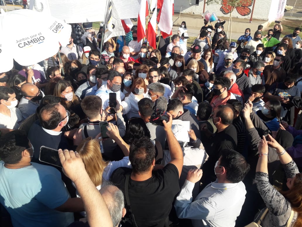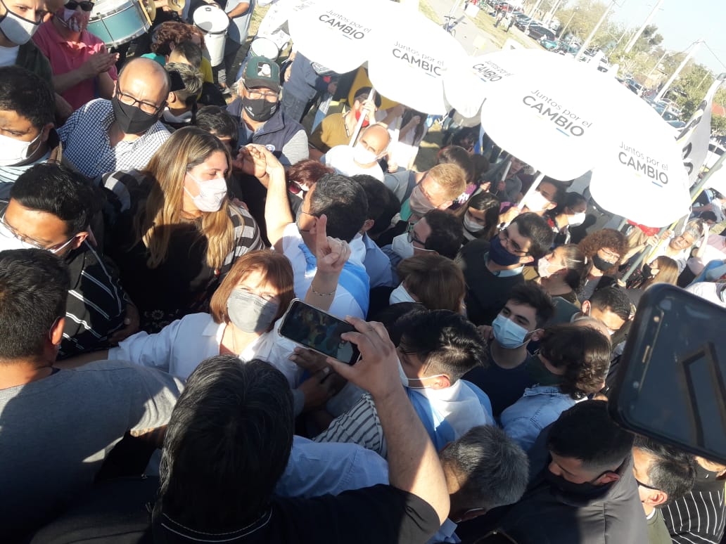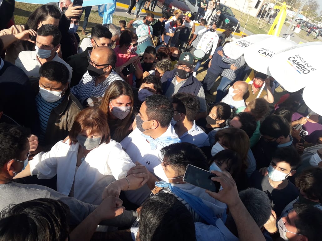 En tiempos de pandemia, la presencia de la dirigente Patricia Bullrich tuvo de todo menos protocolos. La convocatoria que hizo Juntos por el Cambio San Juan fue en el Parque de Rivadavia (Rastreador Calívar, a 100 metros de Avenida Libertador), a las 17 y contó con muchos militantes y curiosos, varios de ellos interesados en una selfie con la jefa del PRO. Pero terminó siendo un tumulto, uno pegado a otro, sin distanciamiento social y, en algunos casos, ni siquiera barbijos bien puestos.