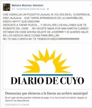 “Che disimiluá un poquito! jajajaj si volvás en el 10 espera al diez jajajaja… que tarde aprendimos de la campaña del miedo hayyy que miedo!!!!! dedicate a tapar pozos,,,, y devolver los millones que te robaste del osse … no hiciste nada por San Martin cuando estabas en osse ahora dejate de joder!!!!! y si querés salir en los medios hace cosas para brillar… no te das cuenta no te tenemos miedo!!!!!!!!!!!!!!!!!!!!!!!!!!!!”, escribió la mujer en su cuenta de Facebook.