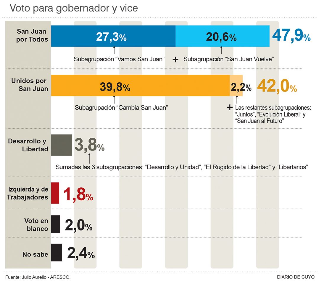 A 10 días de la elección provincial, una encuesta de ayer revela que el frente oficialista San Juan por Todos (SJxT), que lidera Sergio Uñac, roza el 48 por ciento de los votos y le saca casi 6 puntos de ventaja a Unidos por San Juan (UxSJ), la principal alianza opositora que conduce Marcelo Orrego. De acuerdo a ese sondeo y de confirmarse esos números, el senador Rubén Uñac se convertiría en el próximo gobernador y el intendente de San Martín, Cristian Andino, en su vice, ya que ambos, inclusive, se impondrían en la "interna" contra la dupla José Luis Gioja – Fabián Gramajo, por lo que se quedarían con sus votos de acuerdo a lo que establece el nuevo mecanismo electoral, el cual es igual a Lemas.