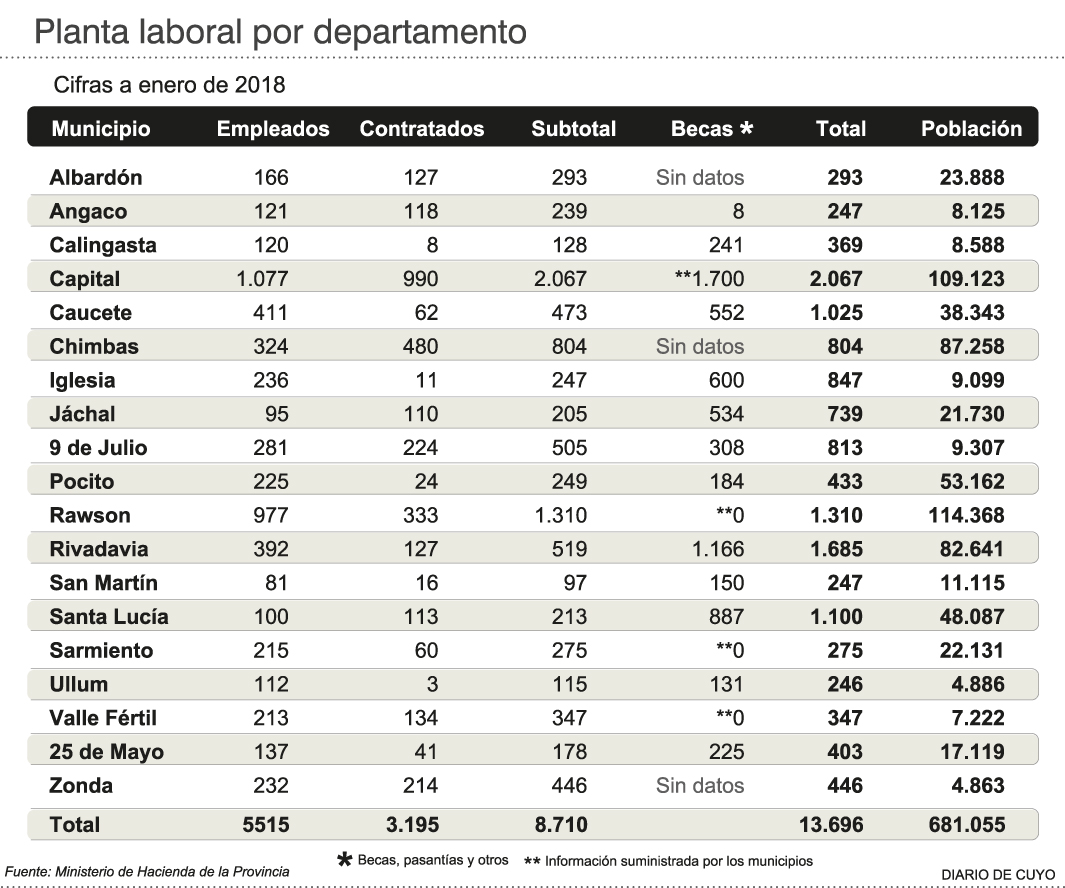 Y el que salió aún más con los tapones de punta fue Gattoni. Resaltó que Santa Lucía y Rivadavia son de las comunas que más personal no registrado, como pasantes, tienen (Ver infografía) y que su incorporación ha crecido en los últimos años. Además, aseguró que son los dos únicos distritos que se han quejado del envío de fondos y que, junto a Caucete, vienen percibiendo aportes del macrismo en concepto de ATN.