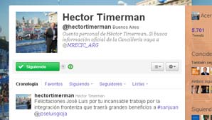 El canciller Héctor Timerman, de asiduas publicaciones en la red social, envió esta mañana sus felicitaciones al gobernador sanjuanino por su "trabajo por la integración fronteriza".