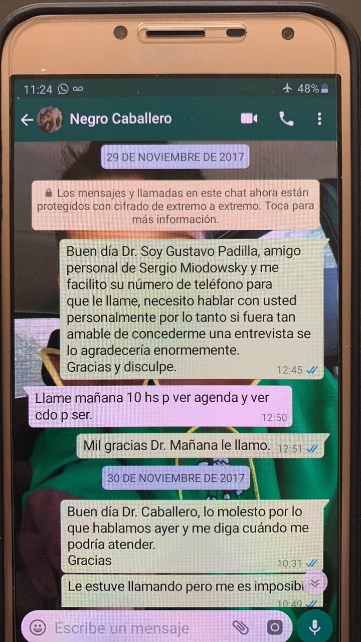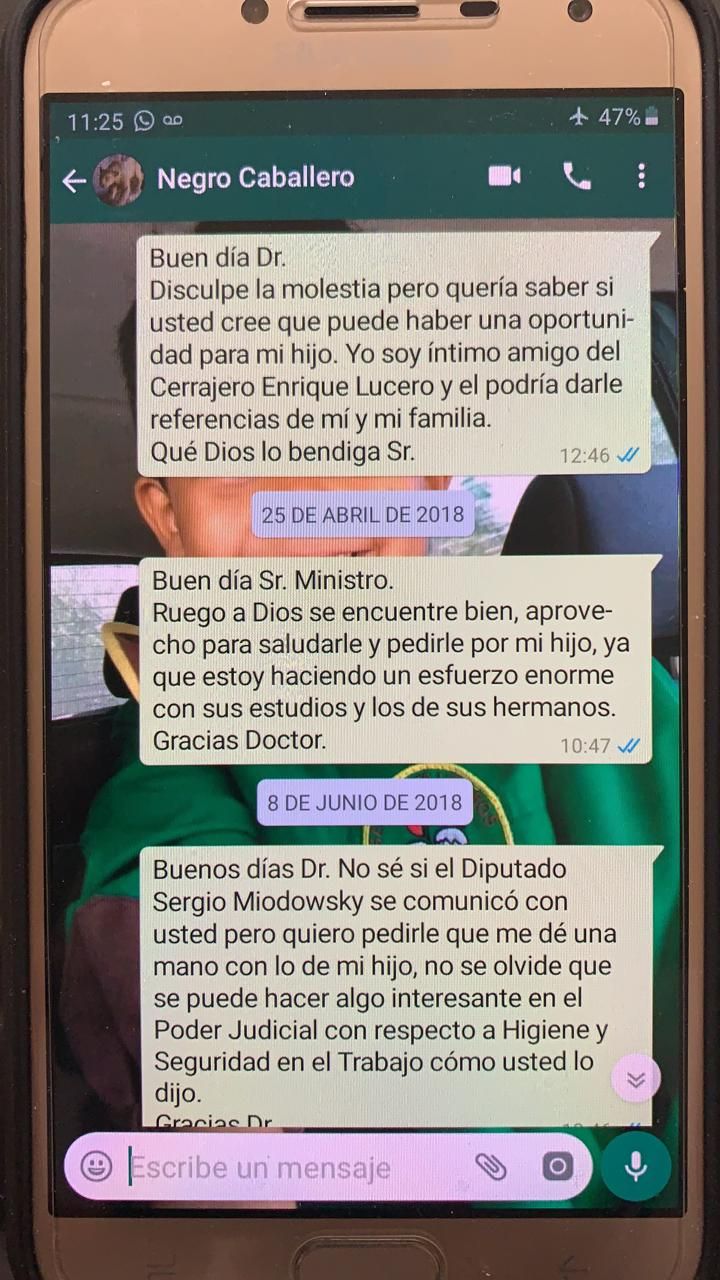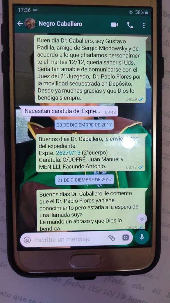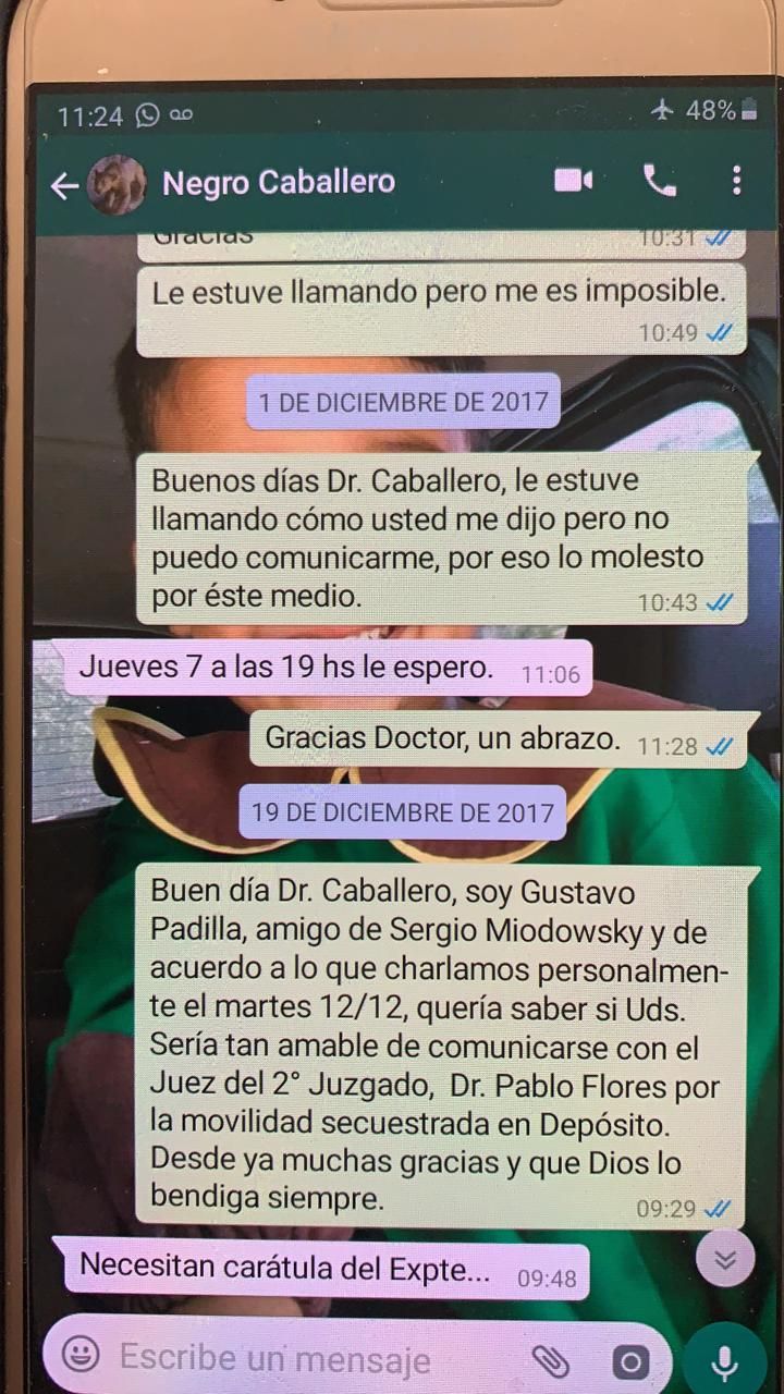 El comisario Gustavo Adolfo Padilla, exjefe del depósito judicial y que espera los avances de la causa tras las rejas, tenía en su teléfono agendado al por entonces miembro de la Corte de Justicia Adolfo Caballero simplemente como ‘Negro Caballero’. En el expediente que tiene en su despacho Juan Pablo Ortega, a cargo del Primer Juzgado en lo Correcional, figuran al menos 7 captura de chats entre ambos con pedidos puntuales sobre movilidades.