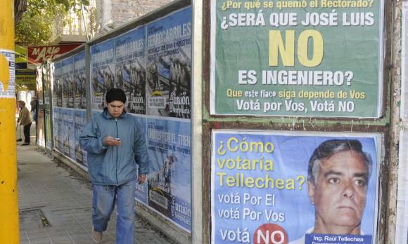 Además de los polémicos afiches de Tellechea, ayer apareció un volante con una foto del conocido actor Diego Capusotto que llama a votar por el NO. Y se vio también un afiche en pleno centro que pregunta si José Luis Gioja será ingeniero.