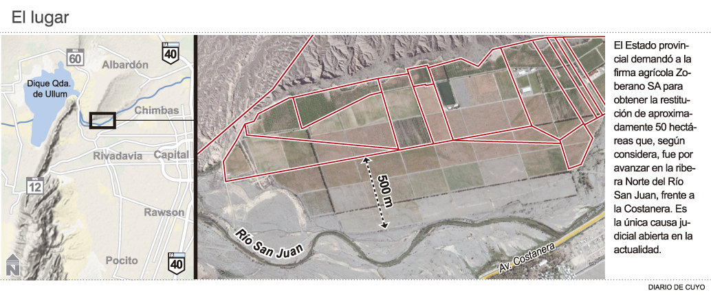 Tras nueve años, la disputa judicial por unas 50 hectáreas del lecho del río San Juan sobre las que la empresa Agrícola Zoberano amplió sus plantaciones tuvo una definición. La Corte de Justicia local rechazó un último planteo de la compañía, por lo que quedó firme un fallo de primera instancia, el cual ordena que la firma debe retirar sus cultivos en un plazo de 40 días a contar desde fines del mes pasado, deshacer los cambios que hizo y restituir el cauce a su estado natural, aseguraron fuentes judiciales. Era el único litigio sobre la llamada línea de ribera, el límite jurídico entre el dominio privado del público en ríos y arroyos, por ejemplo. Dicha delimitación no está trazada en la provincia (ver recuadro), pero después de todo el trámite en la causa Zoberano, el máximo tribunal judicial ya sentó posición sobre el tema.