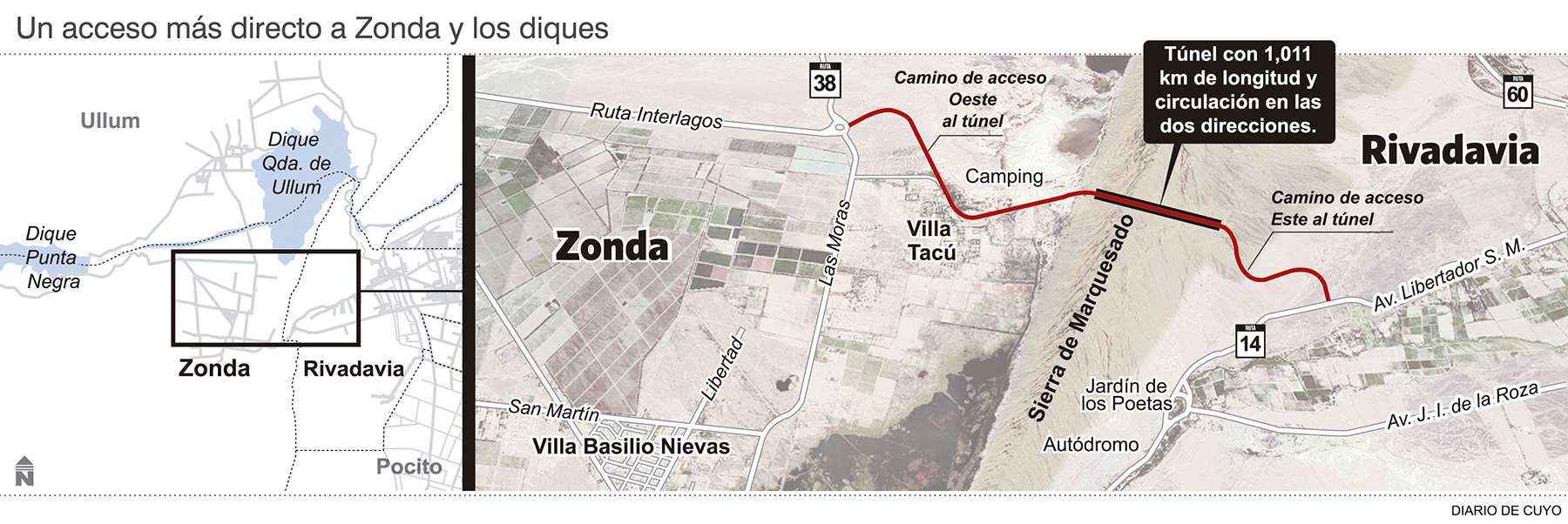El OK de la comisión evaluadora no es menor, porque la obra del Túnel de Zonda es central para la gestión uñaquista. Es que, al tratarse de aportes internacionales, no estarán comprometidos recursos locales que se verán afectados con la reestructuración de presupuesto que encarará el Ejecutivo, por el aumento salarial que dispuso el Gobernador para los empleados estatales. El monto del proyecto, casi 8.500 millones de pesos, responde a la magnitud de la obra que contempla la construcción de un túnel de 1.070 metros sobre la Sierra de Marquesado y el respectivo camino, el cual permitirá una vinculación más directa entre Rivadavia y Zonda, ya que acortará la distancia que hoy se recorre por la llamada Quebrada de Zonda (ver infografía). Además, se trata de un túnel multipropósito porque no sólo contemplará la circulación vehicular, sino también que contendrá el paso de las cañerías del acueducto Gran Tulum, una red de gas, fibra óptica y también un tendido eléctrico. En el momento que se realizó la apertura del sobre económico, que se dio a fines del mes pasado, Hernán Pardo, director comercial de Conosur de la compañía, había señalado que las tareas generarán, en promedio, 300 puestos de trabajo directos.