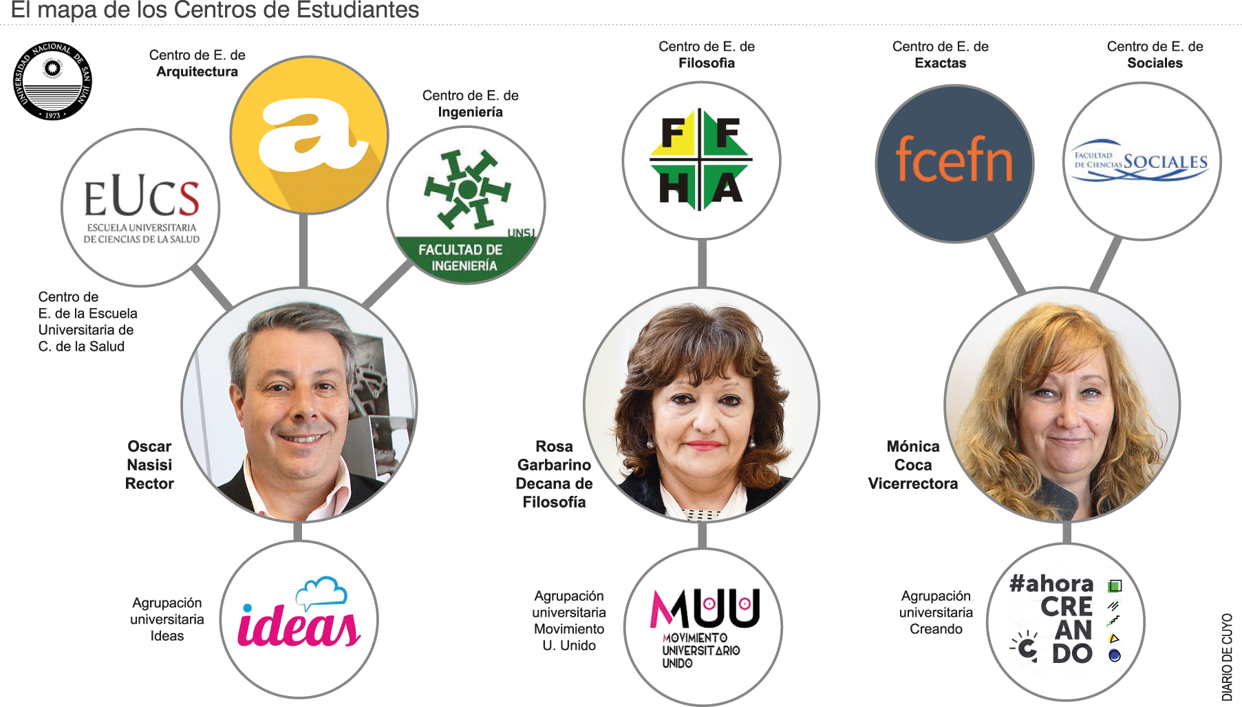 El rector aparece ligado a Ideas, agrupación vinculada al peronismo y que tiene entre sus referentes al actual diputado Juan Pablo Santiago Gioja. El grupo estudiantil se impuso en los Centros de Estudiantes de las facultades de Ingeniería y Arquitectura y en la Escuela de Ciencias de la Salud. En esta última unidad académica, la puja entre Nasisi y Coca se trasladó a la disputa entre las agrupaciones, dado que Ideas destronó a Creando. Esta última juega con la vice, quien se encuentra alejada del rector, al punto que Nasisi desplazó a dos secretarias del Rectorado cercanas a Coca. Creando tiene una fuerte adhesión al giojismo y entre sus cabezas se encuentran Eduardo Camus, de Kolina, el partido que fundó Alicia Kirchner (que en San Juan perdió la personería política), y Lucas Molina. La agrupación retuvo el Centro de las facultades de Ciencias Sociales (bastión de la vicerrectora) y Exactas.