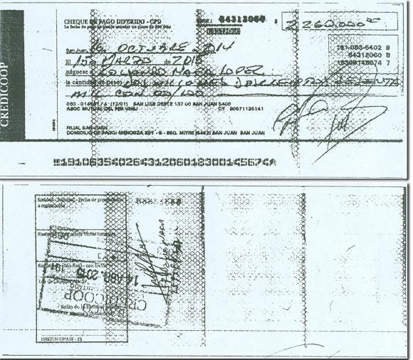 Según pudieron reconstruir los miembros de la Mutual, incluso por los dichos de testigos, Nafá López era poseedor hasta octubre del año pasado de varios cheques que sumaban 1,4 millones de pesos, pero negoció con los exdirectivos que también están siendo investigados, para que le dieran un solo cheque con vencimiento el 15 de marzo de este año por 2.260.000 pesos. Si la operación fue pactada un 16 de octubre de 2014, tal como aparece en el valor, y el vencimiento operaba en marzo, es decir 5 meses después, el interés cobrado fue superior al 12% mensual, un valor muy por encima al que se pacta con entidades crediticias, que oscila en el 4% mensual.