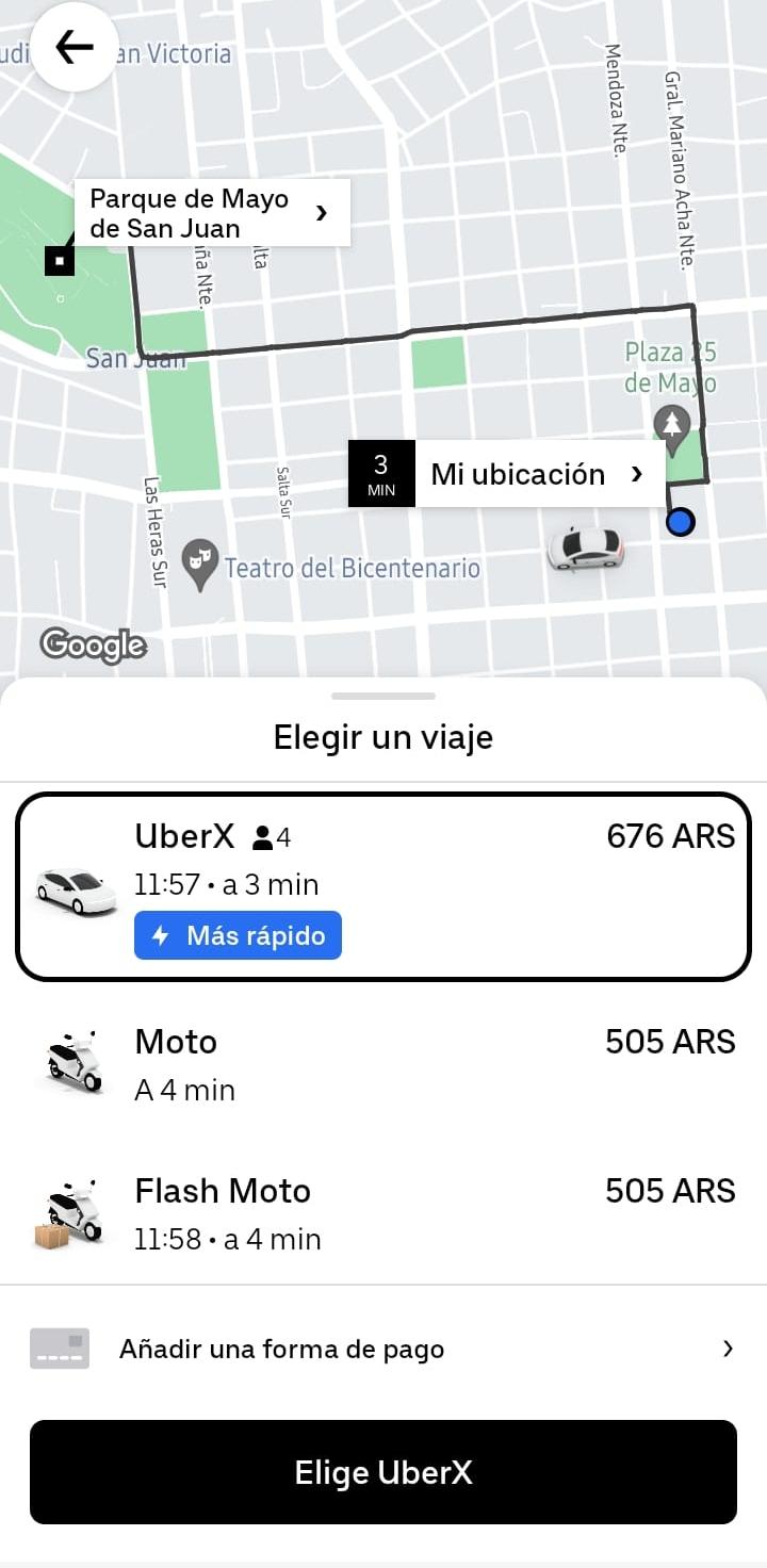 A ingresar a la aplicación, el usuario podrá visualizar su ubicación y elegir el destino. En este sentido, Uber muestra el recorrido, el tiempo, el precio y las unidades disponibles para el traslado, que pueden ser auto o moto.