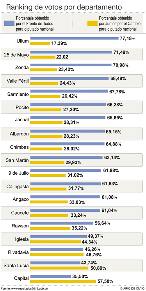 Es la tabla de posiciones que los intendentes relojean y exhiben a la hora de sacar chapa por los resultados obtenidos en sus tierras para ofrendar a sus líderes partidarios. Por el contrario, si los números son adversos, miran para otro lado. En la elección del domingo, en la categoría de diputados nacionales, Ullum se ubicó en la cima de los departamentos con la victoria más holgada para el Frente de Todos y en el global. El contraste fue Capital para el frente oficialista, terruño que tuvo la cifra más baja y, como contraposición, fue en el que Juntos por el Cambio obtuvo el guarismo más elevado (Ver infografía).