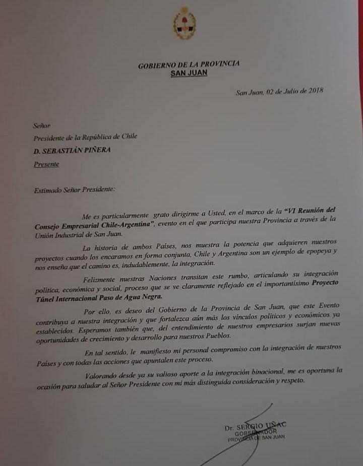 En ese marco, el sanjuanino le hizo llegar una carta a Sebastián Piñera enviada por el mandatario provincial, “aportar un granito de arena en este gran sueño que es el Túnel de Agua Negra”.