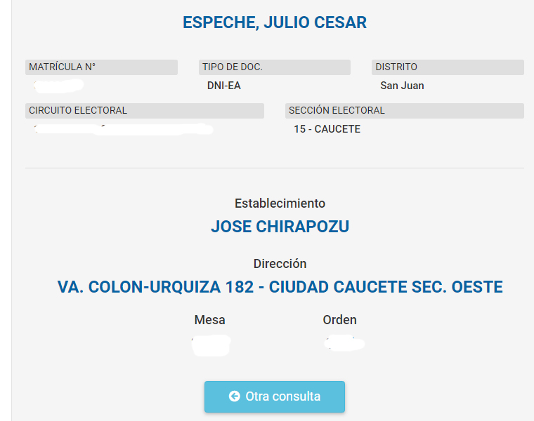 De acuerdo a la información que se encuentra en internet, el difunto votaría donde lo hizo siempre, en la Escuela José Chirapuzo, de Caucete. Justamente, la edición impresa de DIARIO DE CUYO de hoy, informó que corrigieron un error y se agregaron 4.000 nuevos electores para estos comicios nacionales. Por lo que, este caso podría ser un nuevo error no considerado del sistema informático que envía la Cámara Nacional Electoral para la generación del padrón.