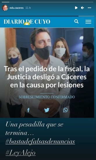 La primera reacción pública de Eduardo Cáceres al enterarse que fue desligado de la causa por violencia contra Gimena Martinazzo fue en las rede sociales. "Una pesadilla que se termina", escribió en una historia de Instagram con una imagen de la noticia publicada ayer en la tarde por este medio.