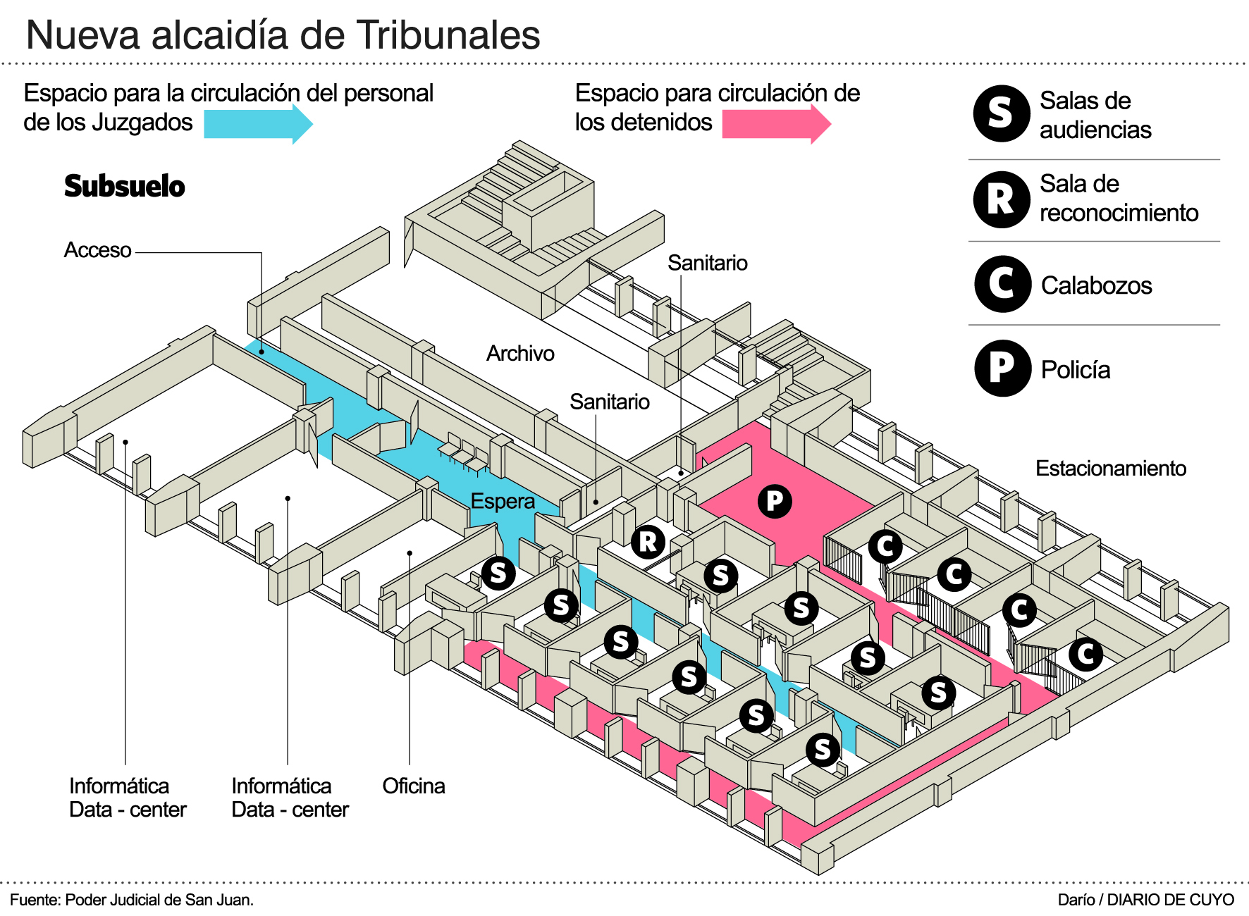 Si bien en un principio estaban previstas siete salas de audiencia para la recepción de indagatorias o para que los reclusos sean notificados de medidas de los juzgados, la Corte de Justicia replanteó el proyecto y decidió elevar a 10 el número de instalaciones. Además sumó la construcción de dos baños en el subsuelo, lo que permitirá que los internos se muevan dentro de ese perímetro. Así se evitará lo que ocurre actualmente: cuando una de las personas que está alojada en los calabozos necesita ir al baño, debe ser trasladada hasta el entrepiso donde se encuentra el sanitario público, al cual también asisten todos aquellos que van asiduamente al palacio de Justicia.
