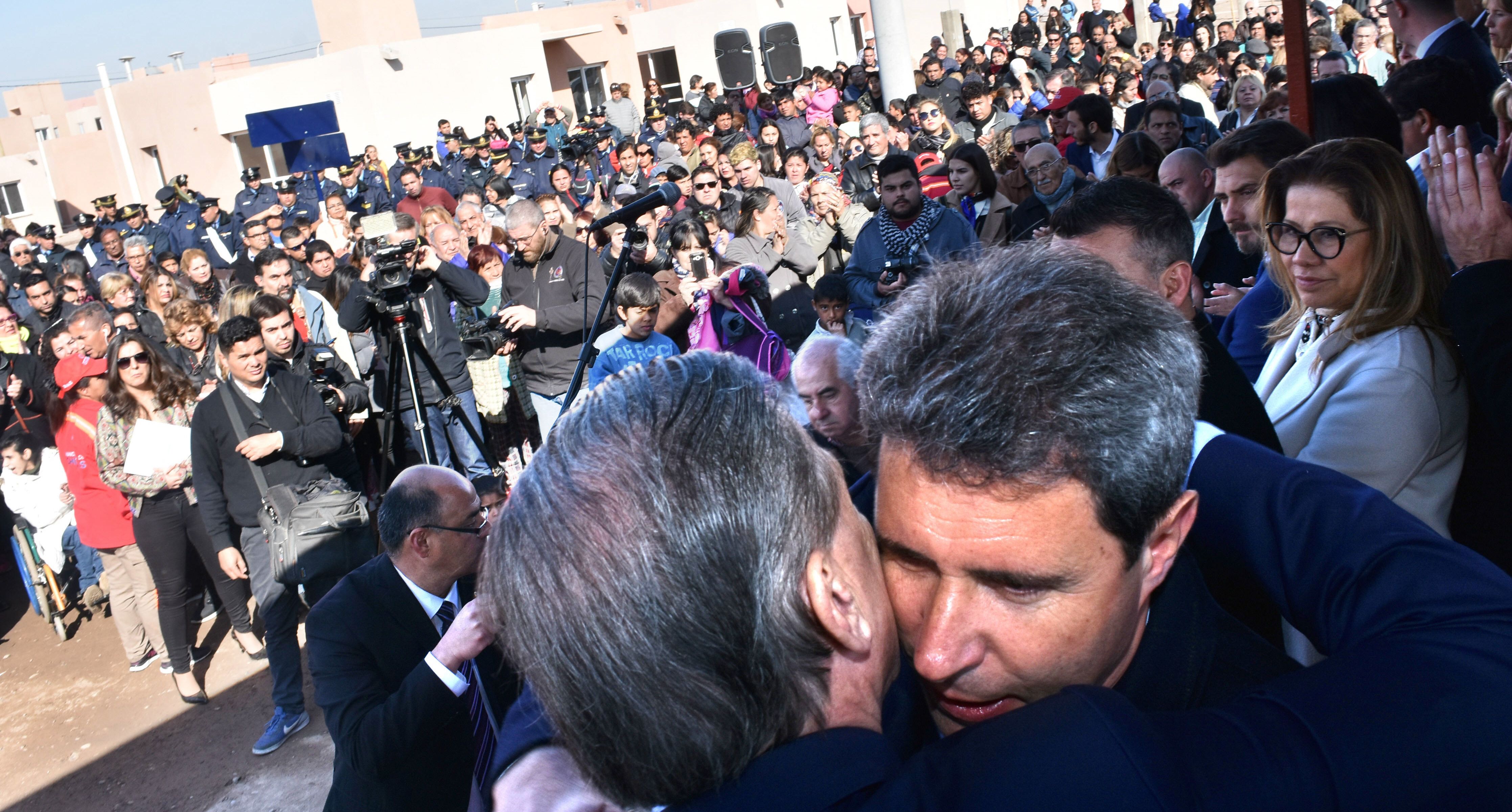 Respaldo. En un acto de entrega de casas en Chimbas, Uñac se fundió en un abrazo con el senador Pichetto. Atrás se ve a Graciela Camaño.