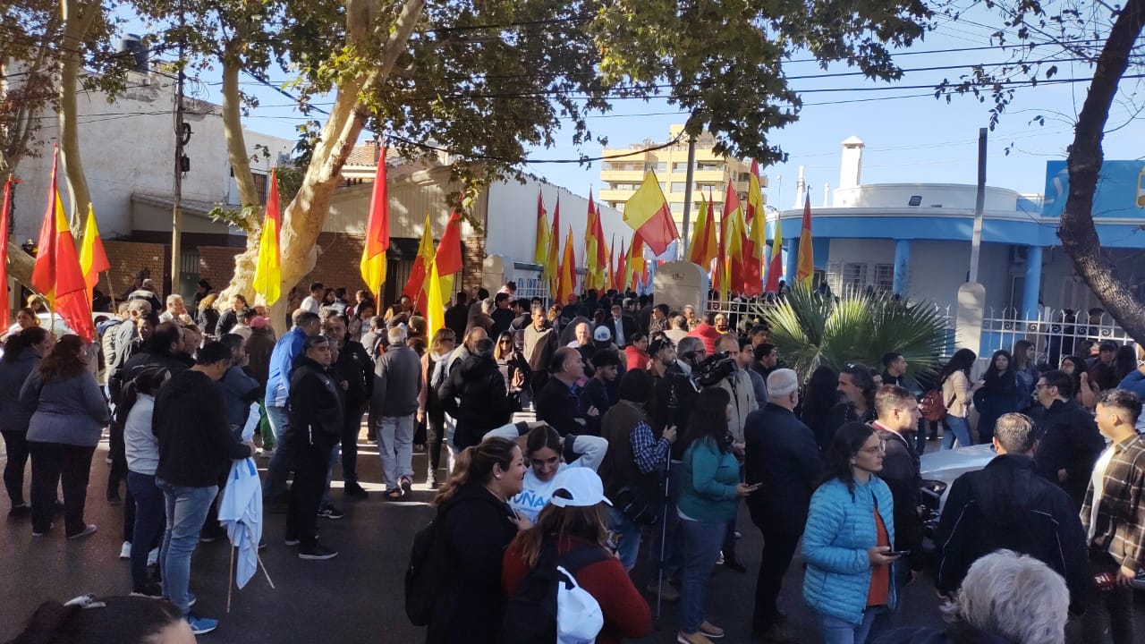 Pasadas las 10:30 de este miércoles, gran cantidad de militantes se reunieron con bombos y banderas frente a la sede del PJ en Capital, hasta donde llegó el gobernador Sergio Uñac para hablar sobre la situación actual de la provincia y las elecciones del próximo domingo, en las que se elegirá intendentes, concejales y diputados.