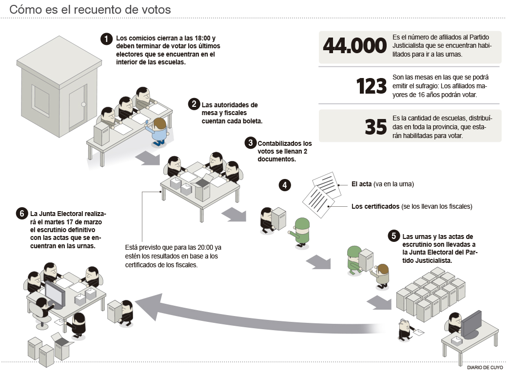 La del justicialismo es como una mini elección provincial, dado que implicará el uso de escuelas en los 19 departamentos. El voto es voluntario y no todos van a sufragar (algunas estimaciones hablan de que la participación podrá ser del 30 por ciento), aunque se verá el poder de fuego en la movilización o el interés de los militantes. Los electores habilitados son los de 16 años en adelante. En cada mesa estará el presidente y el vice, al igual que el fiscal de cada lista. Por escuela, cada lista tendrá su fiscal general y también se encontrará presente el delegado de la Junta Electoral del PJ, organismo que es la máxima autoridad en el comicio, que tiene la función de contralor y de resolver los planteos de algún afiliado o cualquiera de las partes. Habrá 40 veedores judiciales dispuestos por la Justicia Federal con competencia electoral y cinco estarán presentes en el recuento de votos del escrutinio definitivo, el cual se llevará a cabo el martes en la sede del PJ (ver infografía).