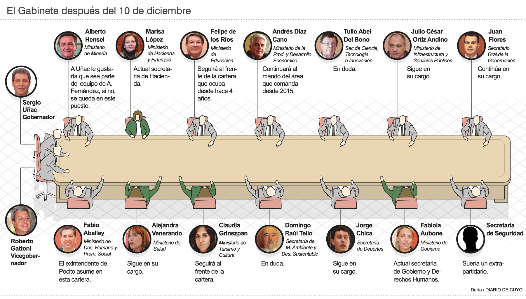 Con las confirmaciones de que secretarios de distintas áreas ocuparán otros cargos o ascenderán en jerarquía en el Ejecutivo, Uñac deberá nombrar a nuevo personal. Así ocurrirá en Salud, Producción, Hacienda y Gobierno. Dichos funcionarios son clave ya que representan los brazos ejecutores de las directivas que bajan tanto el Gobernador como sus ministros.
