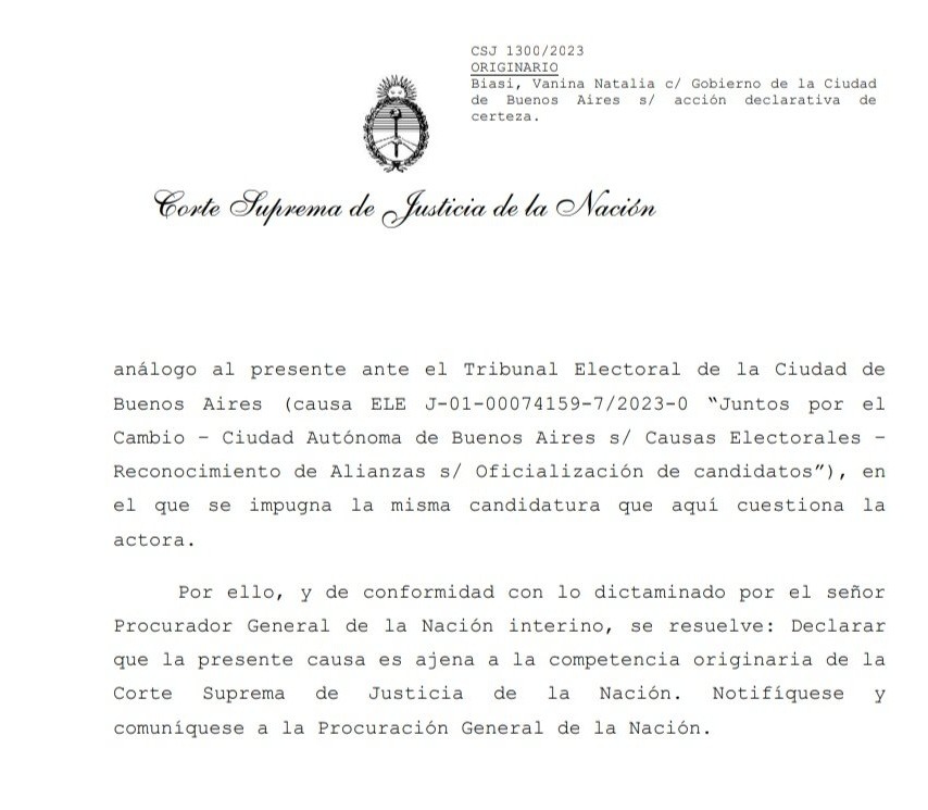 El fallo lleva la firma de los ministros Horacio Rosatti, Carlos Rosenkrantz y Juan Carlos Maqueda, quienes resolvieron declarar que “la presente causa es ajena a la competencia originaria de la Corte Suprema de Justicia de la Nación.”
