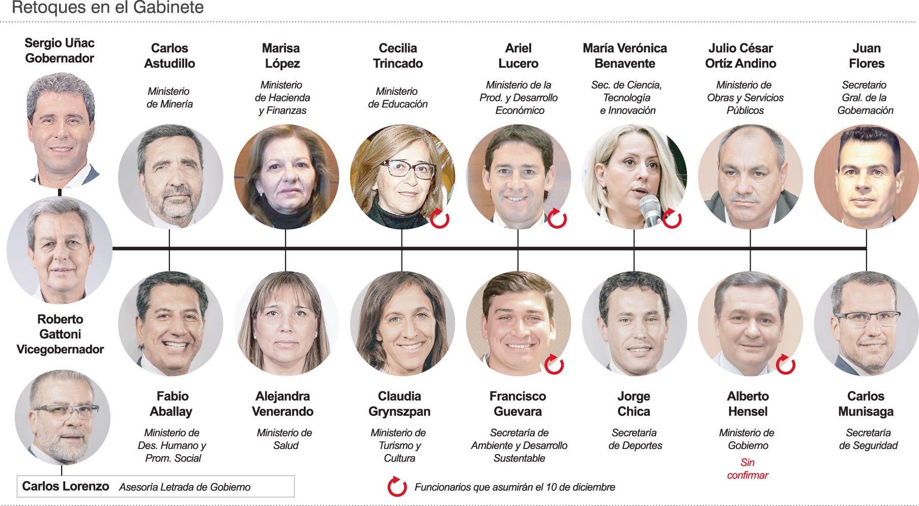 Había anunciado que, en la mitad de su segundo mandato, iba a analizar si hacía retoques en su Gabinete. El plazo se cumple este viernes y, tras las elecciones legislativas, el gobernador Sergio Uñac ejecutó los cambios de gestión más drásticos en lo que lleva gobernando. Son cinco modificaciones: Cecilia Trincado reemplazará a Felipe De los Ríos en el Ministerio de Educación, Ariel Lucero ocupará el sillón de Andrés Díaz Cano en Producción, María Verónica Benavente asumirá en lugar de Tulio Del Bono en la Secretaría de Ciencia y Tecnología y Francisco Guevara sucederá en Ambiente a Raúl Tello. En el Ministerio de Gobierno, el recambio es obligado, dado que Fabiola Aubone asumirá como diputada nacional y quien suena con fuerza es Alberto Hensel, secretario de Minería de la Nación.