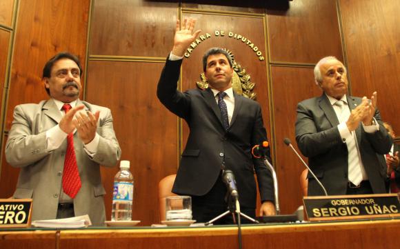 Uñac reivindicó los 12 años de su “compañero y amigo” Gioja y se las arregló para salir con humor de una situación inusual. Se perdió en la lectura y tras reconocer a las risas que se perdió en el párrafo que estaba leyendo, dijo: “Vamos a empezar de nuevo”.
