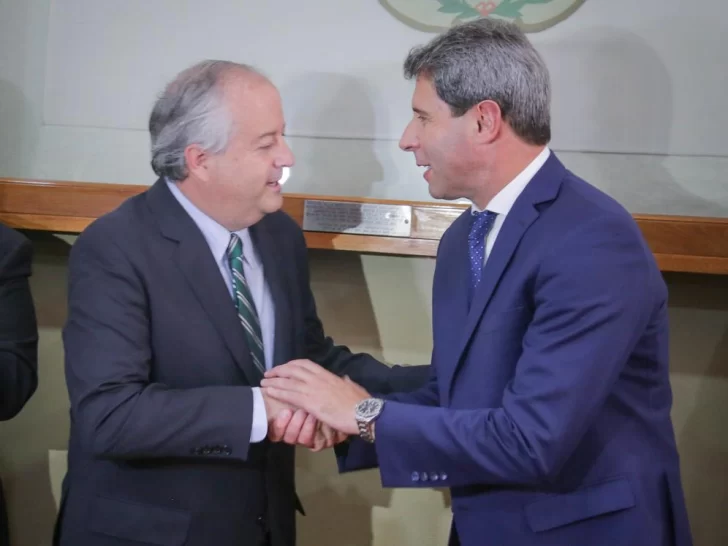 En Casa de Gobierno, Sergio Uñac recibió al embajador de Chile en Argentina, Nicolás Monckeberg Díaz. Luego de pasar revista a la Banda de Música de la Policía de San Juan, el embajador chileno recibió el saludo del gabinete provincial, para posteriormente trasladarse a la Sala Pablo Ramella donde el gobernador Sergio Uñac hizo entrega del decreto que lo declara “Huésped de Honor”, junto a un presente que consistió en una moneda de plata realizada por un artesano local.
