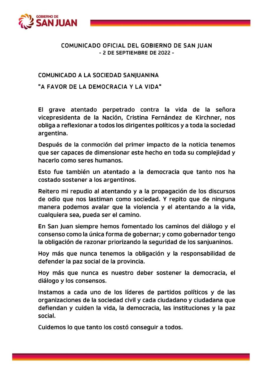Este viernes en la mañana, el gobernador Sergio Uñac convocó a una reunión de Gabinete en Casa de Gobierno, luego de lo acontecido el jueves en la noche cuando intentaron atentar contra la integridad de la vicepresidenta Cristina Fernández de Kirchner. Tras la culminación del encuentro dialogó con los medios.