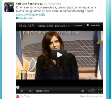 San Juan, 20 de abril.- "En una semana muy energética, que empezó con energía de la buena, inauguramos en San Juan un parque de energía solar", escribió la presidenta Cristina Fernández de Kirchner hoy en tu twitter oficial, dandole entidad y relevancia al acto que encabezó ayer en San Juan.